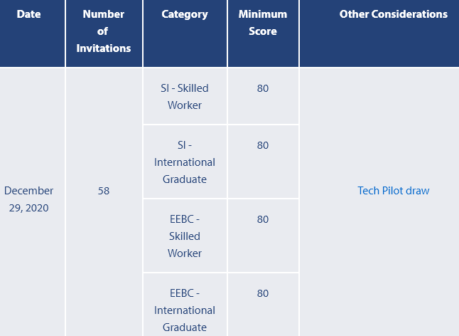 美加金联从加拿大BC省移民部获悉:2020年12月29日BC省移民部公布技术移民筛选分数:技术工人类别(SI-Skilled Worker)筛选分数80分,国际留学生类别(SI-International Graduate)筛选分数80分,快速通道技术工人类别(EEBC-Skilled Worker)筛选分数80分,快速通道国际留学生类别(EEBC-International Graduate)筛选分数80分,本轮筛选共计发出58份邀请。