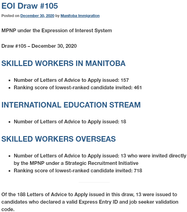 美加金联从曼省移民部获悉:2020年12月30日,曼省省内技术工人筛选分数461分,发出157份邀请。海外技术工人通过战略招聘计划邀请的筛选分数718分,发出13份邀请。国际留学生类别发出18份邀请。本轮总计邀请188人。