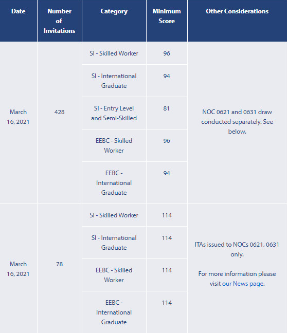 美加金联从加拿大BC省移民部获悉:2021年3月16日BC省移民部公布技术移民筛选分数:技术工人类别(SI-Skilled Worker)筛选分数96分,国际留学生类别(SI-International Graduate)筛选分数94分,中低技术工人类别(SI-Entry Level and Semi-Skilled)筛选分数81分,快速通道技术工人类别(EEBC-Skilled Worker)筛选分数96分,快速通道国际留学生类别(EEBC-International Graduate)筛选分数94分,本轮筛选共计发出428份邀请。本轮邀请将NOC 0621和0631类别单独邀请,邀请分数均在114分,邀请人数为78人。