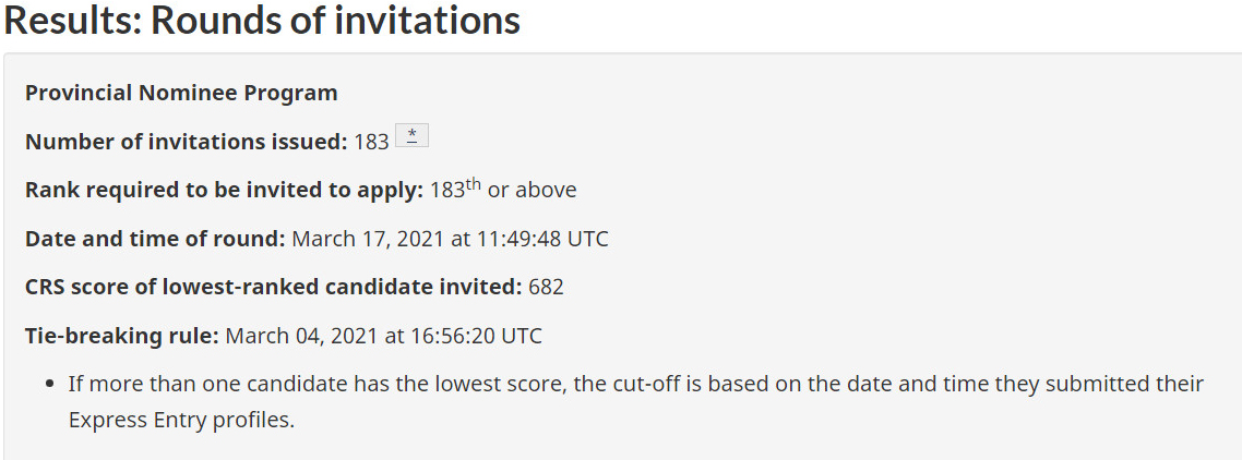 美加金联从加拿大移民部获悉:2021年3月17日加拿大联邦技术移民Express Entry快速通道项目筛选分数为:省提名682分,发出183份邀请。