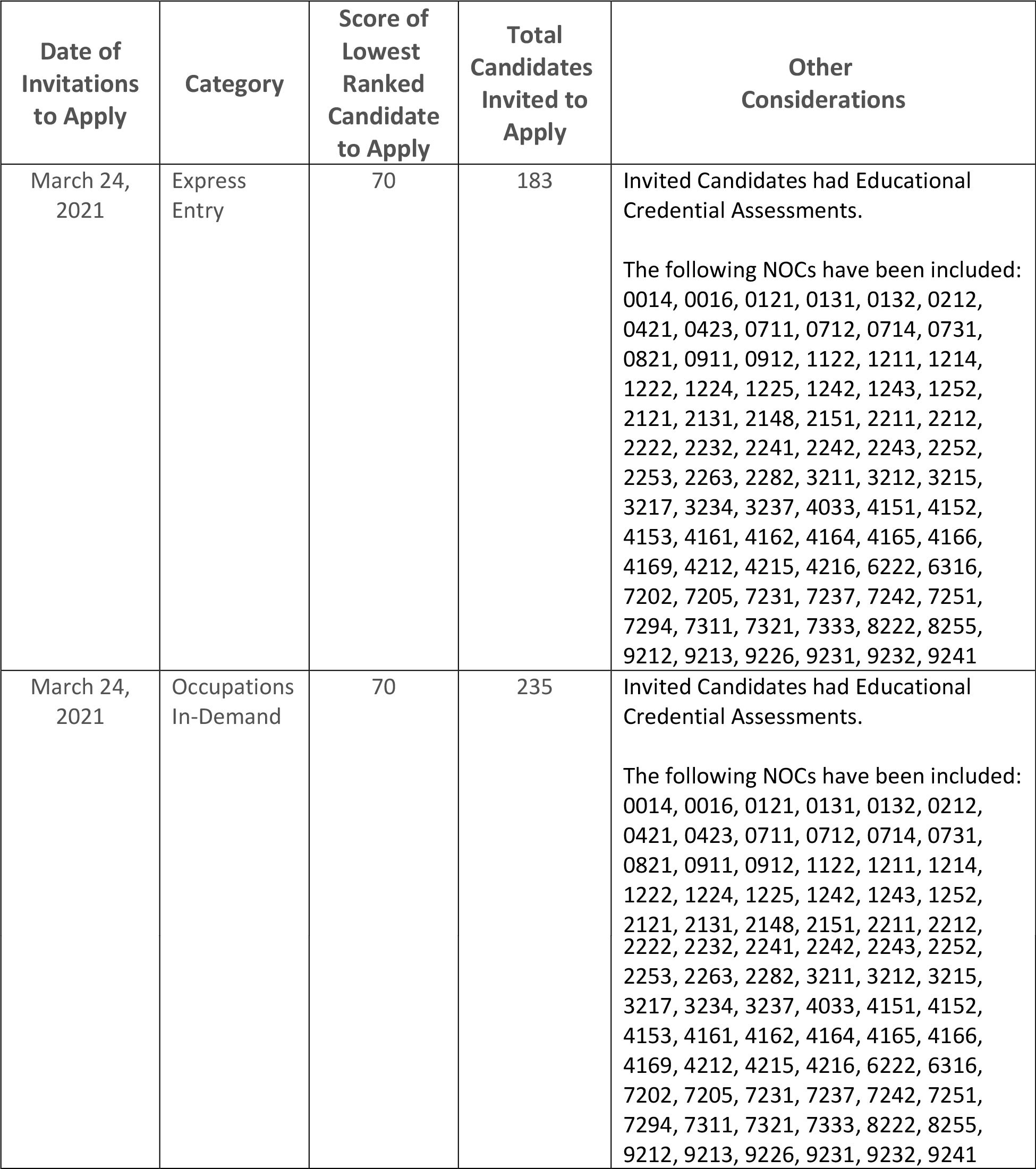 美加金联从加拿大萨省移民部获悉:2021年3月24日萨省技术移民快速通道(Express Entry,简称EE)类别筛选分数70分,发出183份邀请;需求职业(Occupation-in-Demand,简称OID)类别筛选分数70分,发出235份邀请。本轮筛选共计发出418份邀请。
