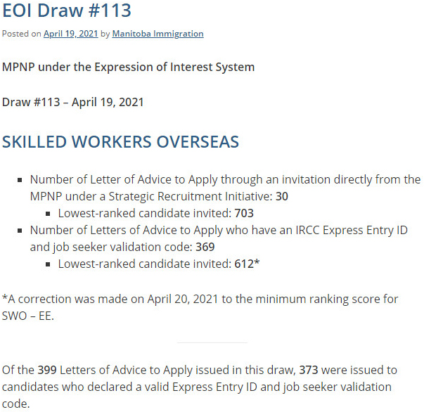 美加金联从曼省移民部获悉:2021年4月19日,曼省海外技术工人通过战略招聘计划邀请的筛选分数703分,发出30份邀请;曼省提名类别联邦技术移民EE快速通道筛选分数612分,发出369份邀请,合计共发出399份邀请。