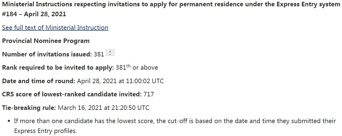 美加金联从加拿大移民部获悉:2021年4月28日加拿大联邦技术移民Express Entry快速通道项目筛选分数为:省提名717分,发出381份邀请。