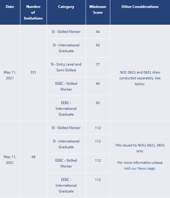 美加金联从加拿大BC省移民部获悉:2021年5月11日BC省移民部公布技术移民筛选分数:技术工人类别(SI-Skilled Worker)筛选分数94分,国际留学生类别(SI-International Graduate)筛选分数92分,中低技术工人类别(SI-Entry Level and Semi-Skilled)筛选分数77分,快速通道技术工人类别(EEBC-Skilled Worker)筛选分数94分,快速通道国际留学生类别(EEBC-International Graduate)筛选分数92分,本轮筛选共计发出331份邀请。本轮邀请将NOC 0621和0631类别单独邀请,邀请分数均在112分,邀请人数为48人。