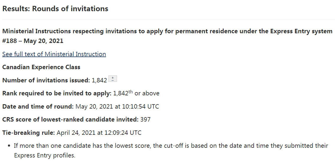 美加金联从加拿大移民部获悉:2021年5月20日加拿大联邦技术移民Express Entry快速通道项目筛选分数为:经验类397分,发出1,842份邀请。