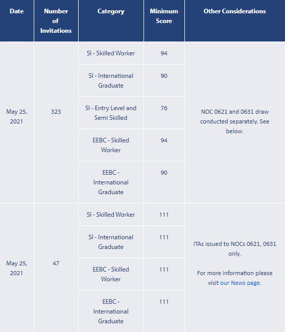美加金联从加拿大BC省移民部获悉:2021年5月25日BC省移民部公布技术移民筛选分数:技术工人类别(SI-Skilled Worker)筛选分数94分,国际留学生类别(SI-International Graduate)筛选分数90分,中低技术工人类别(SI-Entry Level and Semi-Skilled)筛选分数76分,快速通道技术工人类别(EEBC-Skilled Worker)筛选分数94分,快速通道国际留学生类别(EEBC-International Graduate)筛选分数90分,本轮筛选共计发出323份邀请。本轮邀请将NOC 0621和0631类别单独邀请,邀请分数均在111分,邀请人数为47人。