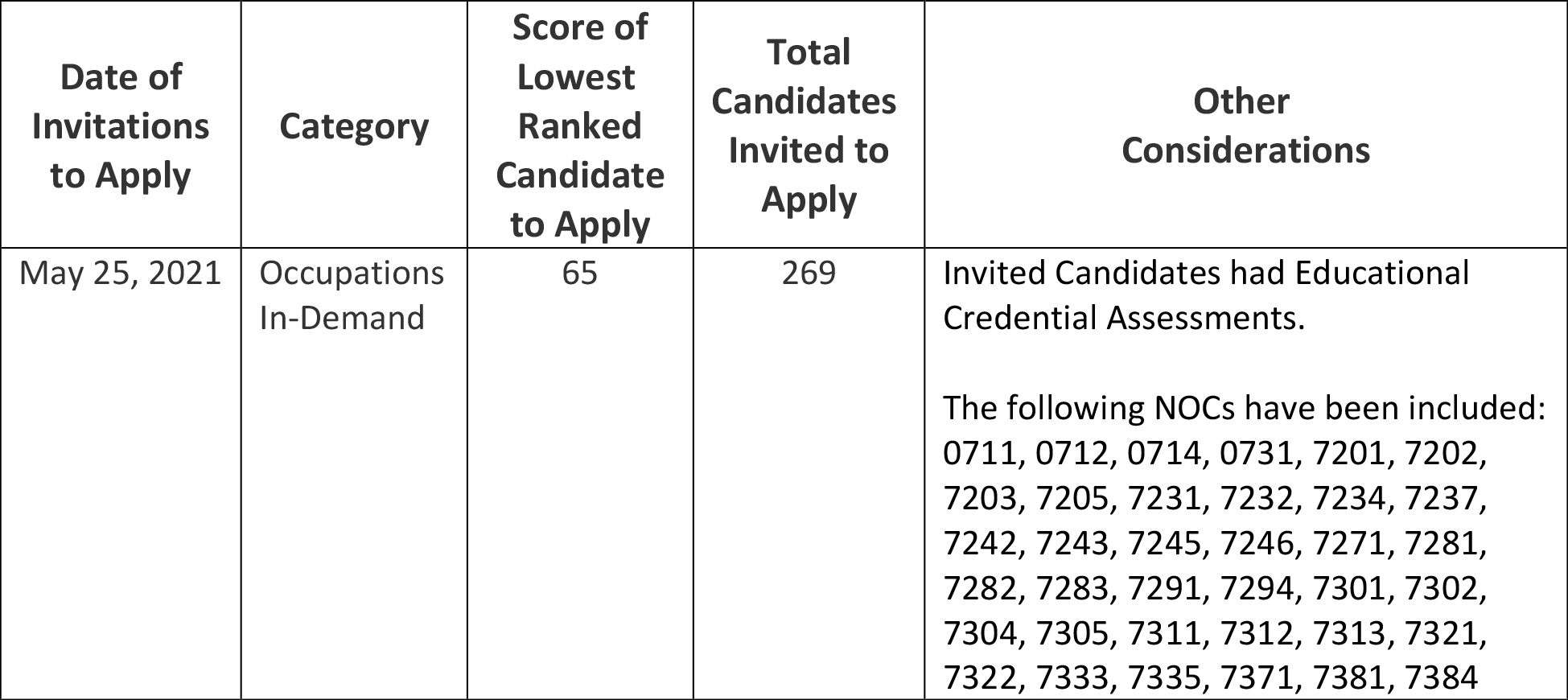美加金联从加拿大萨省移民部获悉:2021年5月25日萨省技术移民需求职业(Occupation-in-Demand,简称OID)类别筛选分数65分,发出269份邀请。