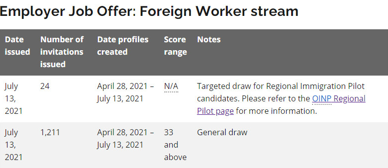 美加金联从加拿大安省移民局获悉:2021年7月13日,安省省提名雇主担保类移民国际技工类(Employer Job Offer: Foreign Worker stream)筛选分数出台: