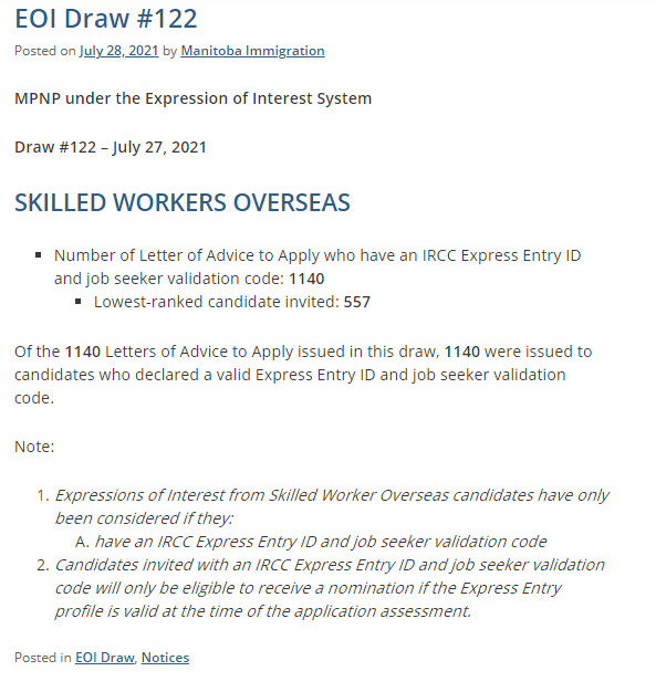 美加金联从曼省移民局获悉:2021年7月27日,加拿大曼省技术移民海外技术工人通过战略招聘计划邀请的筛选分数557分,发出1140份邀请。