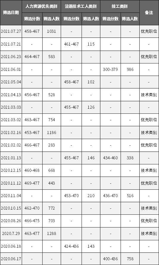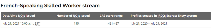 美加金联从加拿大安省移民局获悉:2021年7月21日,安省EE法语技术工人类别( French-Speaking Skilled Worker stream)筛选通过分数(CRS)在461至467分之间,发出115份邀请。