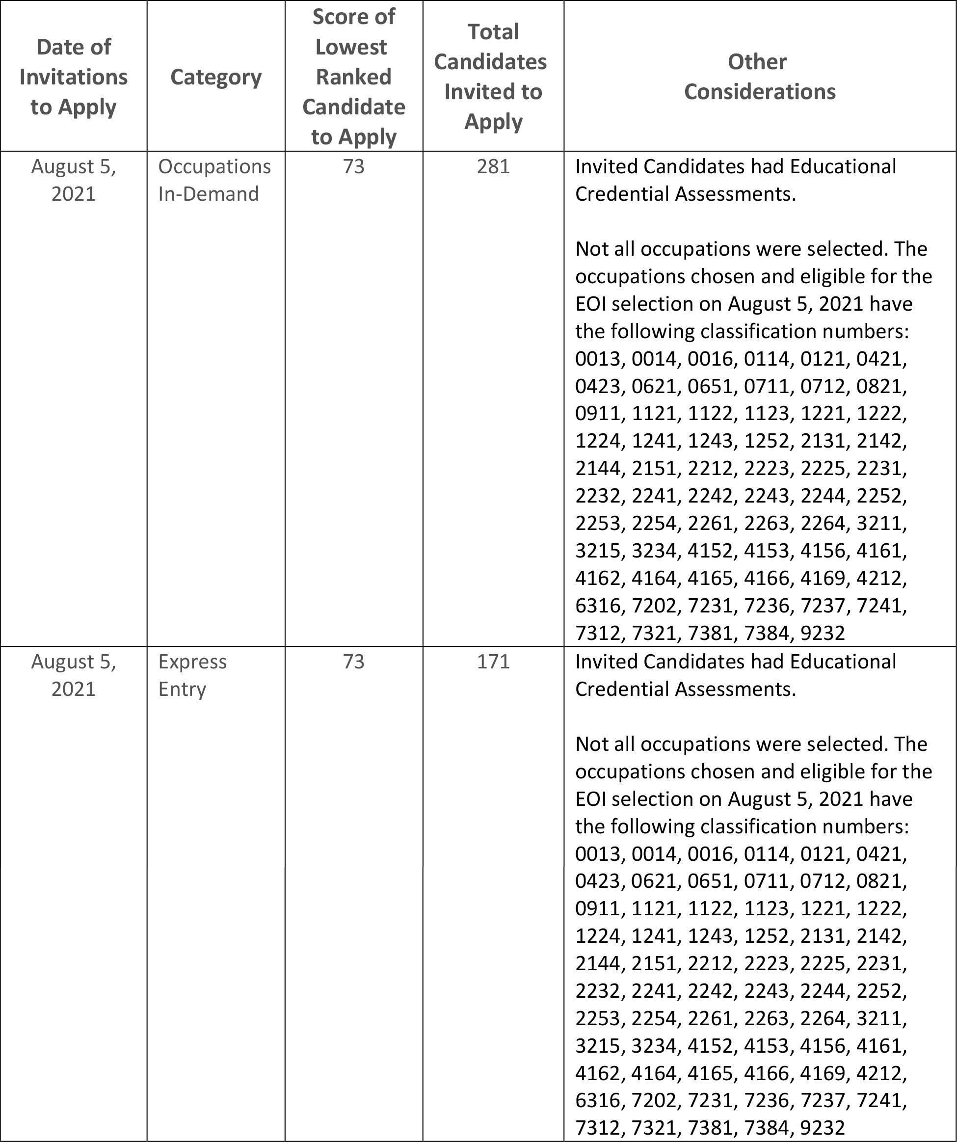 美加金联从加拿大萨省移民局获悉:2021年8月5日萨省技术移民快速通道(Express Entry,简称EE)类别筛选分数73分,发出171份邀请;需求职业(Occupation-in-Demand,简称OID)类别筛选分数73分,发出281份邀请。本轮筛选共计发出452份邀请。