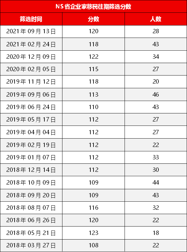 美加金联从加拿大NS省移民局获悉:2021年9月13日NS省企业家移民EOI筛选分数120分,发出28份邀请。