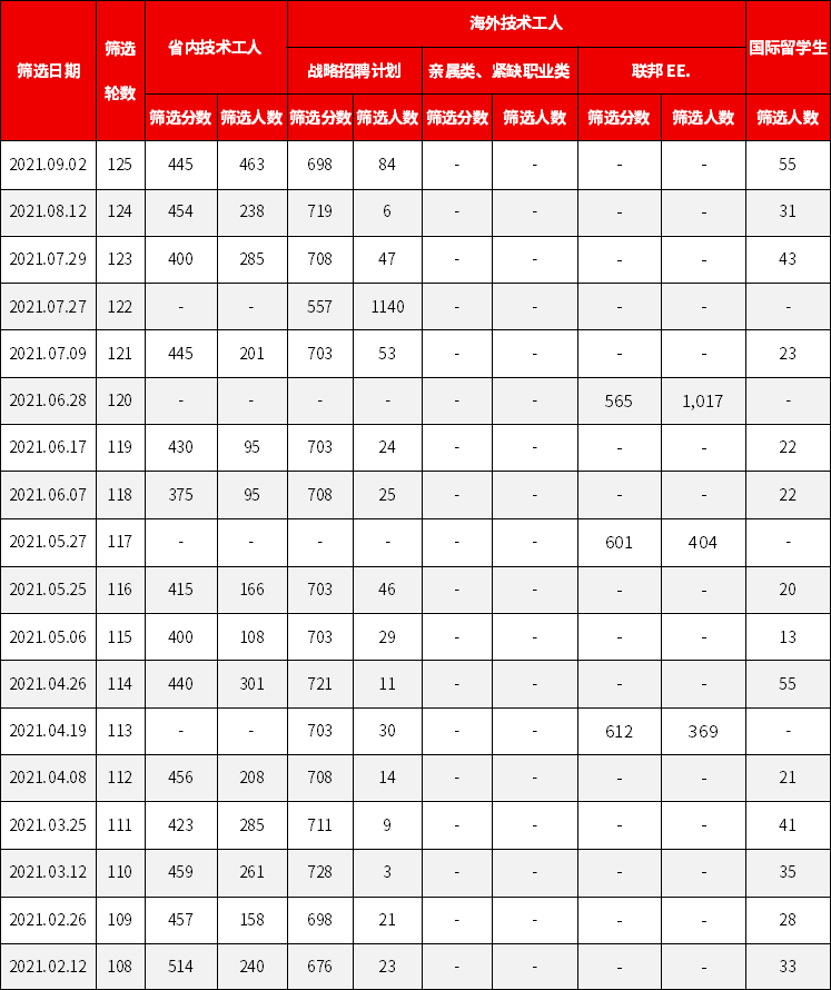 美加金联从曼省移民局获悉:2021年9月2日,曼省省内技术工人(SKILLED WORKERS IN MANITOBA)发出463份邀请,筛选分数445分;国际留学生类别(INTERNATIONAL EDUCATION STREAM)发出55份邀请;海外技术工人通过战略招聘计划邀请的(SKILLED WORKERS OVERSEAS)发出84份邀请,筛选分数698分。本轮总计邀请602人。
