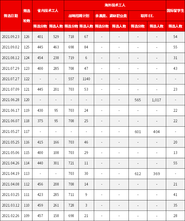 美加金联从曼省移民局获悉:2021年9月23日,曼省省内技术工人(SKILLED WORKERS IN MANITOBA)发出529份邀请,筛选分数401分;国际留学生类别(INTERNATIONAL EDUCATION STREAM)发出54份邀请;海外技术工人通过战略招聘计划邀请的(SKILLED WORKERS OVERSEAS)发出67份邀请,筛选分数718分。本轮总计邀请650人。