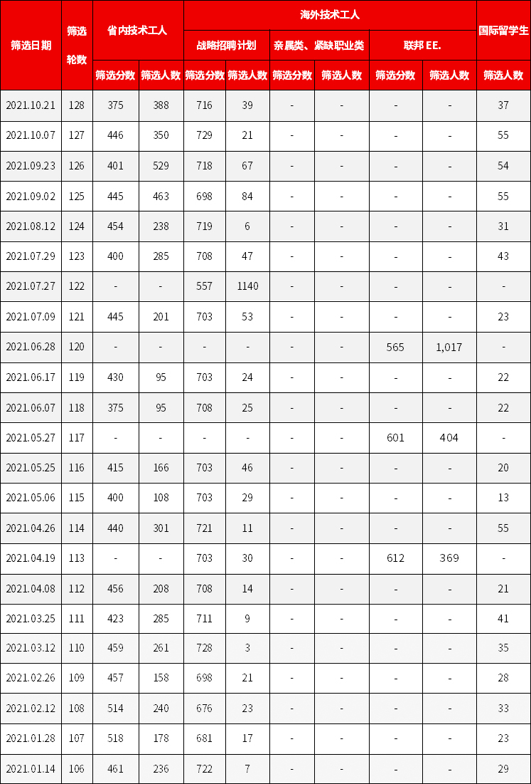 美加金联从曼省移民局获悉:2021年10月21日,曼省省内技术工人(SKILLED WORKERS IN MANITOBA)发出388份邀请,筛选分数375分;国际留学生类别(INTERNATIONAL EDUCATION STREAM)发出37份邀请;海外技术工人通过战略招聘计划邀请的(SKILLED WORKERS OVERSEAS)发出39份邀请,筛选分数716分。本轮总计邀请459人。
