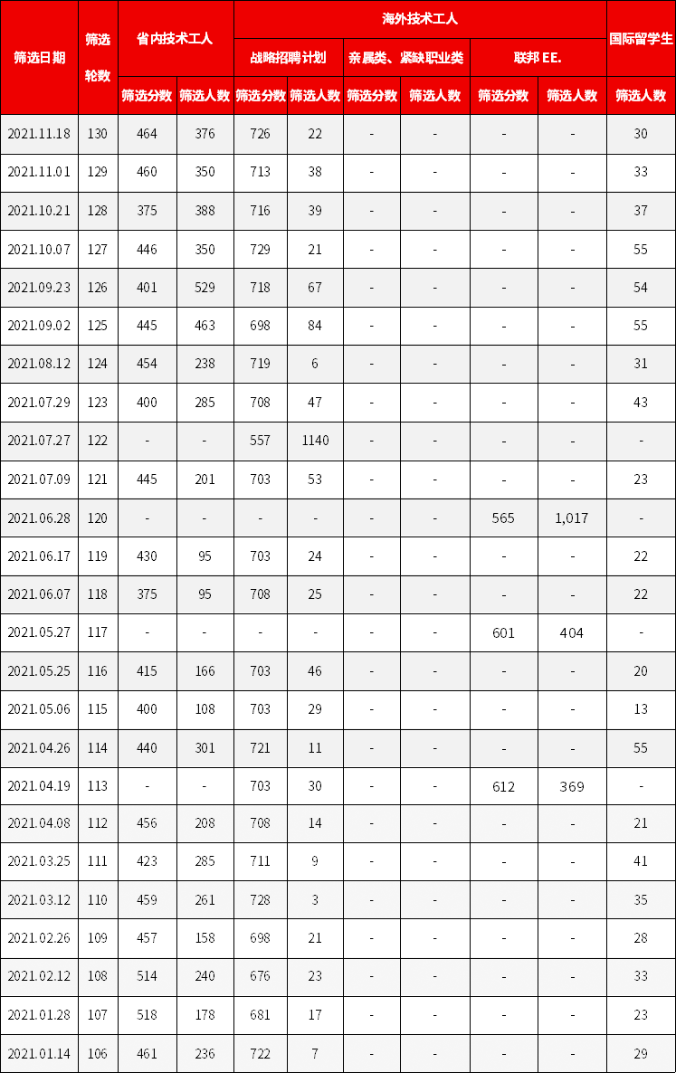 美加金联从曼省移民局获悉:2021年11月18日,曼省省内技术工人(SKILLED WORKERS IN MANITOBA)发出376份邀请,筛选分数464分;国际留学生类别(INTERNATIONAL EDUCATION STREAM)发出30份邀请;海外技术工人通过战略招聘计划邀请的(SKILLED WORKERS OVERSEAS)发出22份邀请,筛选分数726分。本轮总计邀请459人。