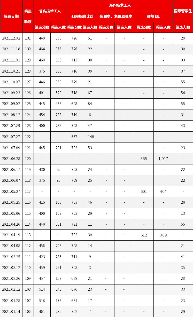 美加金联从曼省移民局获悉:2021年12月2日,曼省省内技术工人(SKILLED WORKERS IN MANITOBA)发出358份邀请,筛选分数449分;国际留学生类别(INTERNATIONAL EDUCATION STREAM)发出29份邀请;海外技术工人通过战略招聘计划邀请的(SKILLED WORKERS OVERSEAS)发出51份邀请,筛选分数726分。本轮总计邀请438人。