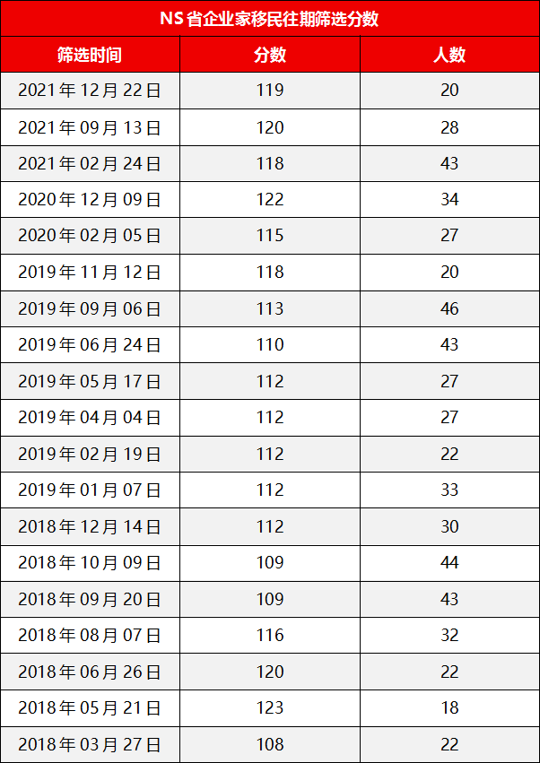 美加金联从加拿大NS省移民局获悉:2021年12月22日NS省企业家移民EOI筛选分数119分,发出20份邀请。