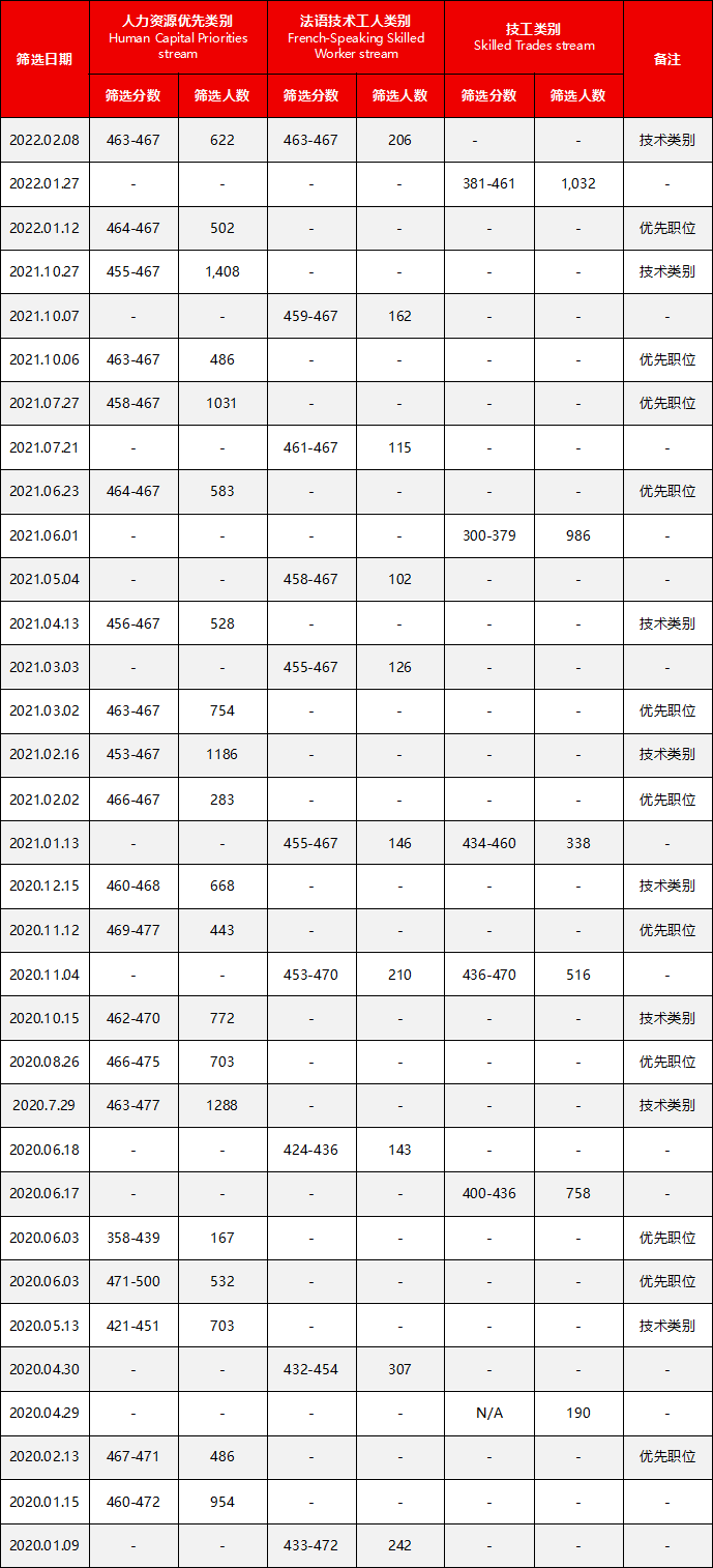 美加金联从加拿大安省移民局获悉:2022年2月8日,安省提名EE快速通道技术移民HCP(Human Capital Priorities Stream)类别发出622份邀请,筛选通过分数(CRS)在463至467分之间。