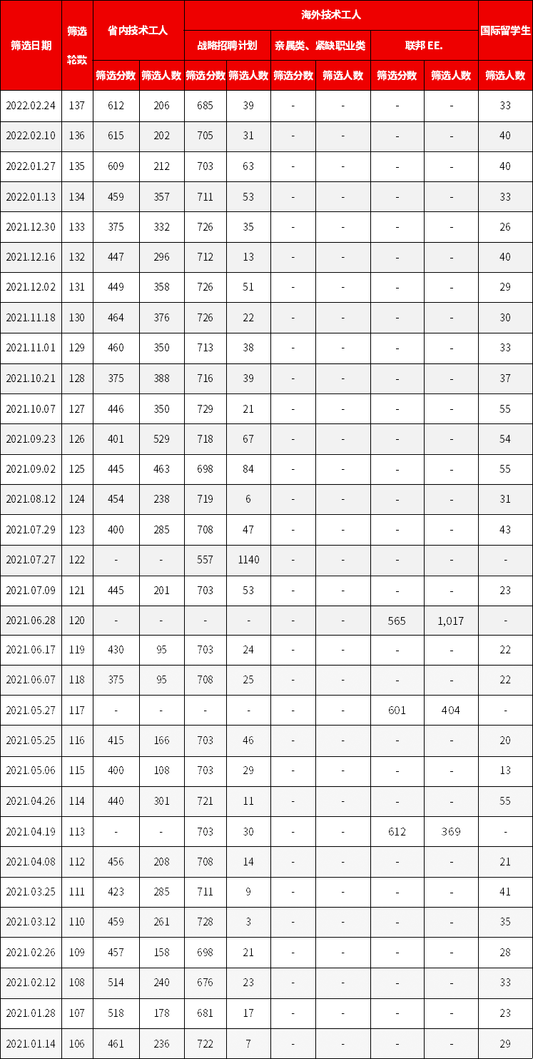 美加金联从曼省移民局获悉:2022年2月24日,曼省省内技术工人(SKILLED WORKERS IN MANITOBA)发出206份邀请,筛选分数612分;国际留学生类别(INTERNATIONAL EDUCATION STREAM)发出33份邀请;海外技术工人通过战略招聘计划邀请的(SKILLED WORKERS OVERSEAS)发出39份邀请,筛选分数685分。本轮总计邀请278人。