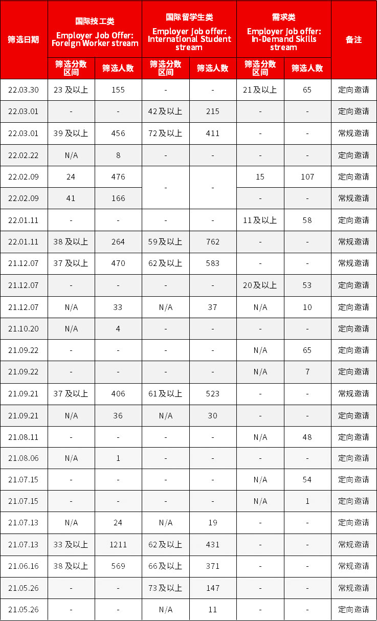 安省提名雇主担保移民2022年3月30日筛选分数: